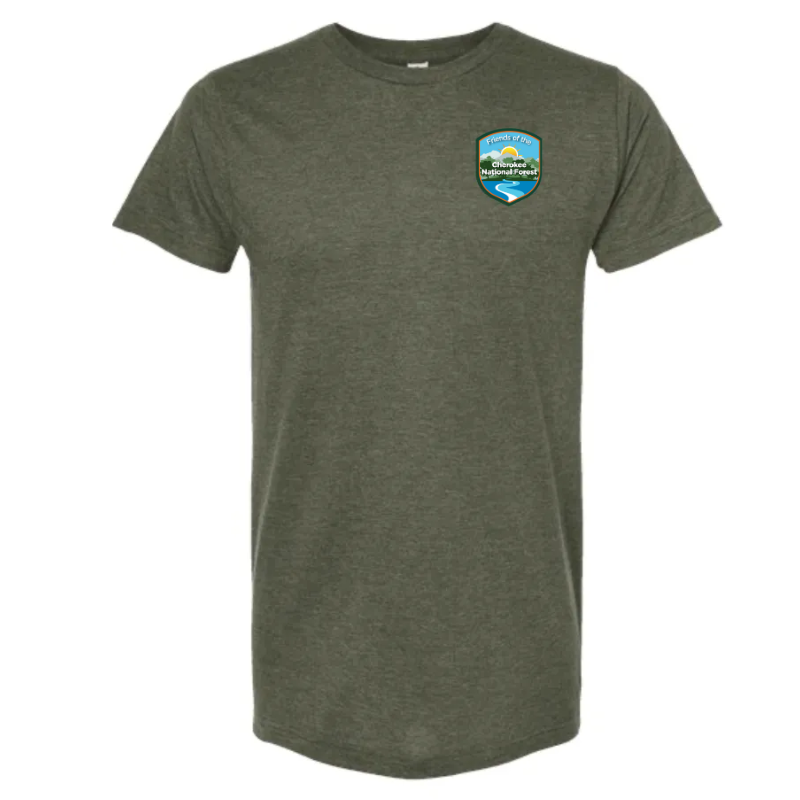 Show your support for the Cherokee National Forest with our Friends of the Cherokee National Forest Logo Tee. This comfortable T-shirt proudly features the stunning logo on the left side of the front, depicting a sun rising over majestic mountains with a forest and river flowing beneath. This rising sun logo symbolizes the cycle of life, new beginnings and opportunities, optimism, and renewal. Available in gray or forest green.