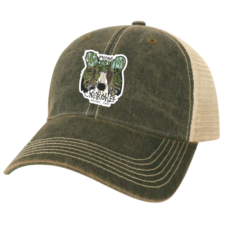 Show off your support for the Cherokee National Forest and let our Forest Bear Spirit guide your way. Perfect cap for hiking and everyday wear. Embroidered patch with original art by renowned artist Matt Brass.